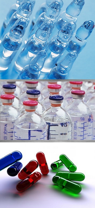 - Glass ampoules, syringe and vacuum filling 1, 2, 5, 10 ml.